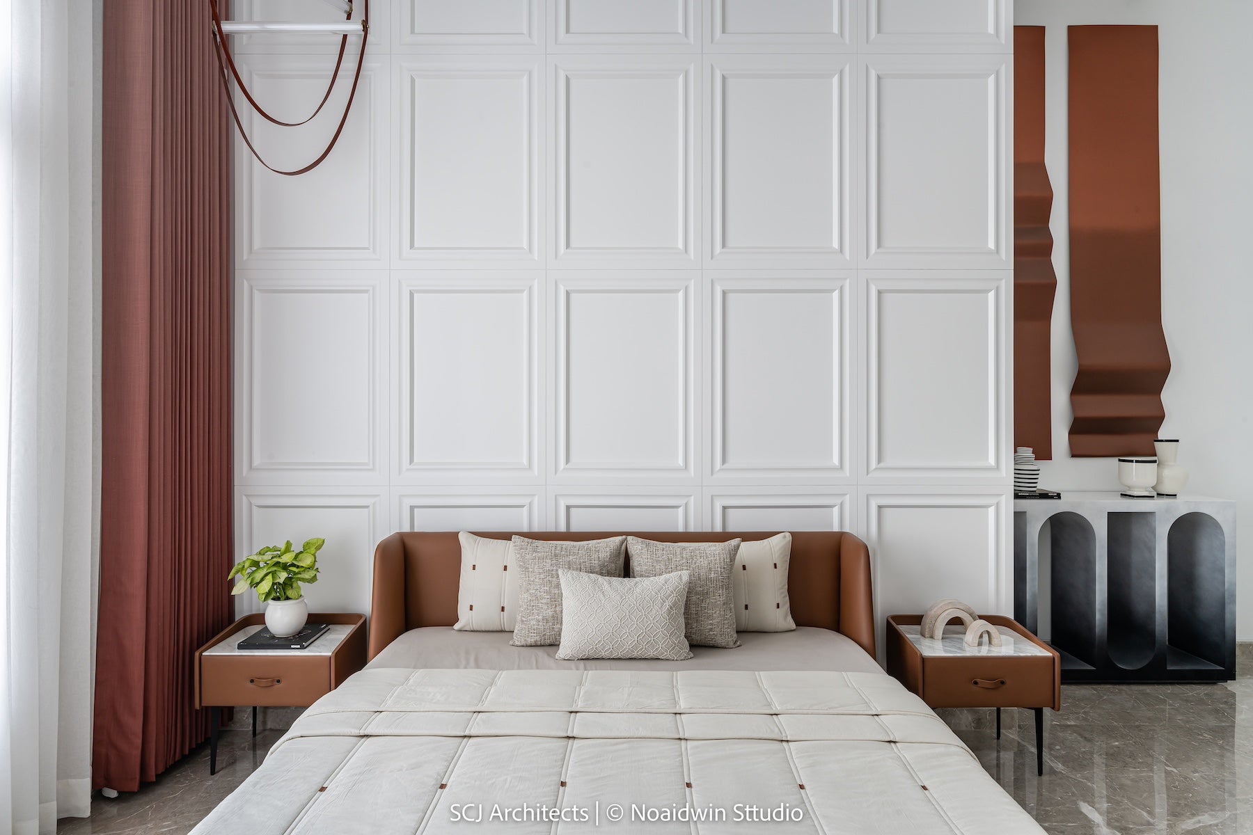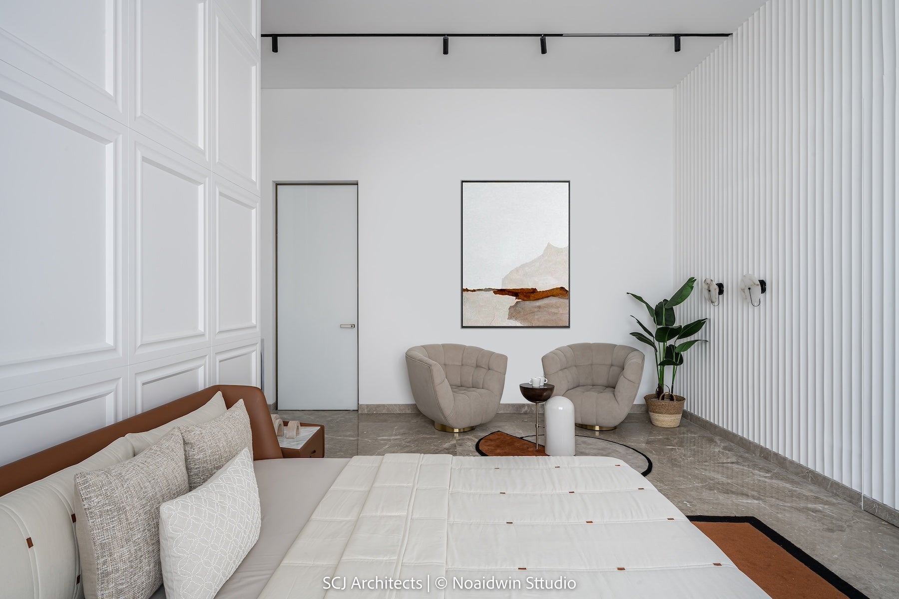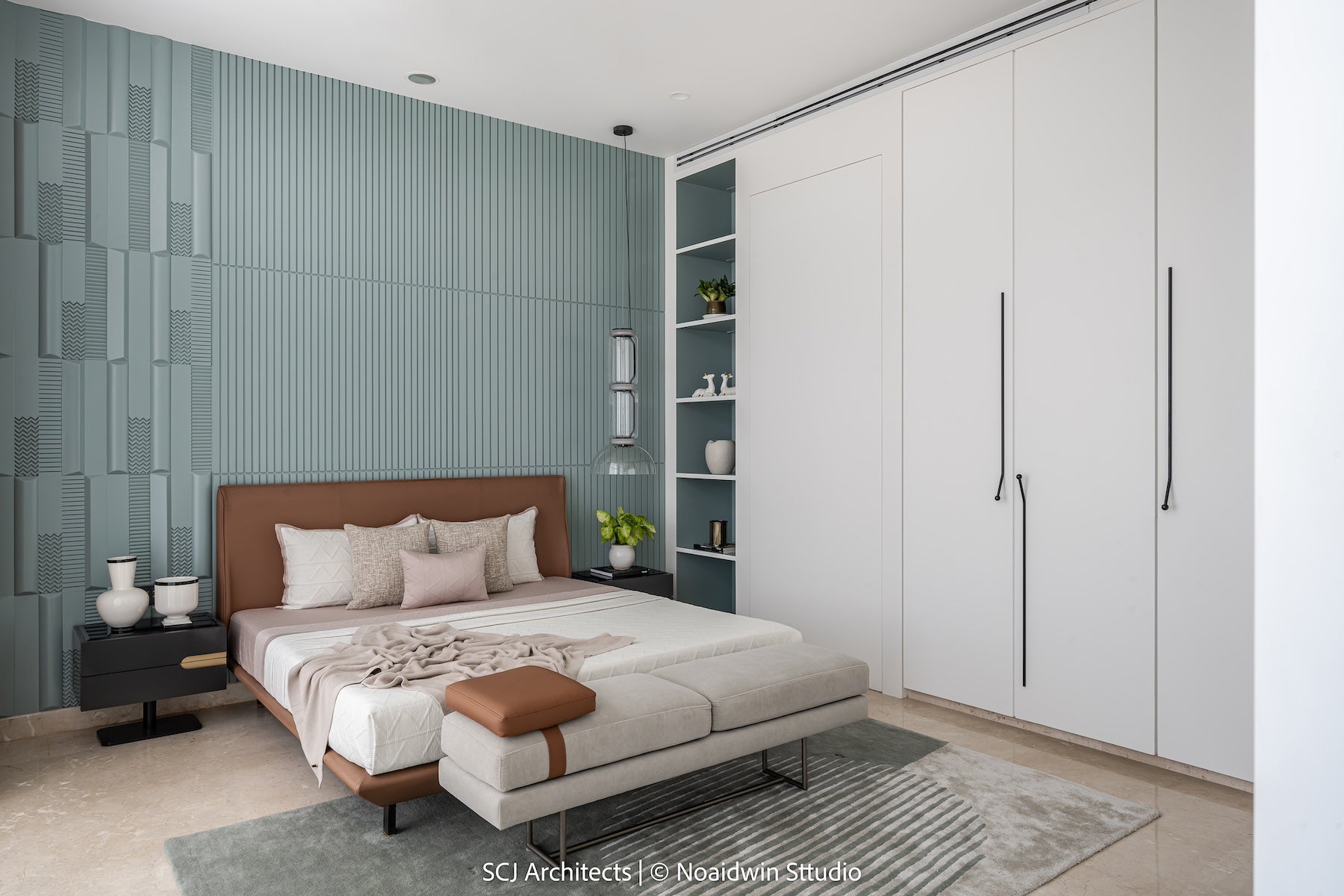 Every bedroom embraces a different mood and aesthetic. A monochromatic palette of whites, greys, and blacks, accentuated by a pop of blue, greens or orange. This interplay of colors adds depth and character to the space, embodying a sense of understated luxury. Hidden storage units in each room ensure a clutter-free environment, enhancing the peaceful atmosphere.