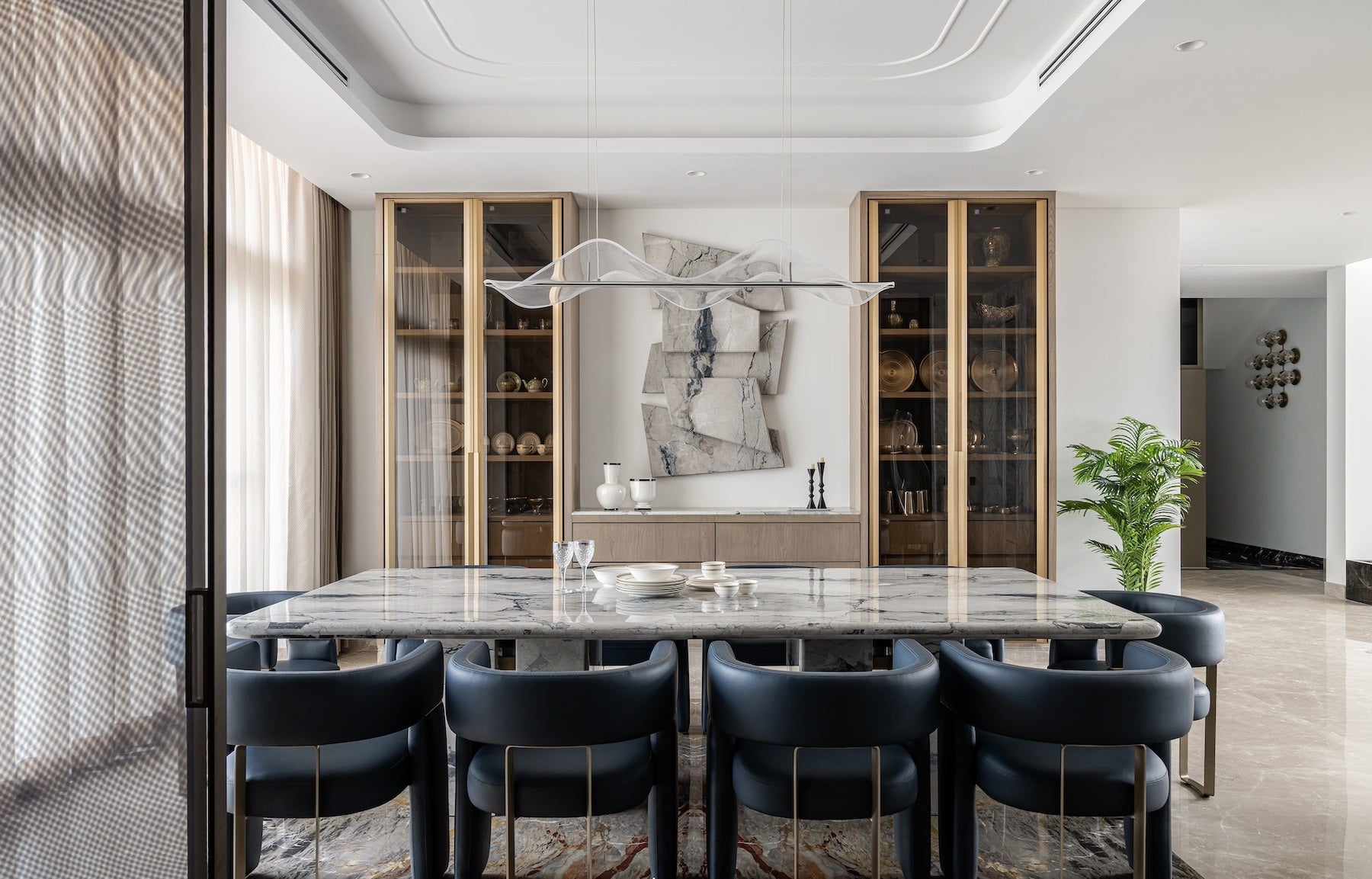 Adjacent to the living room, the dining area features a marble dining table paired with striking blue chairs. This combination adds a contemporary touch, creating a space where every meal becomes a celebration. This blend of textures and hues transforms meals into memorable celebrations.