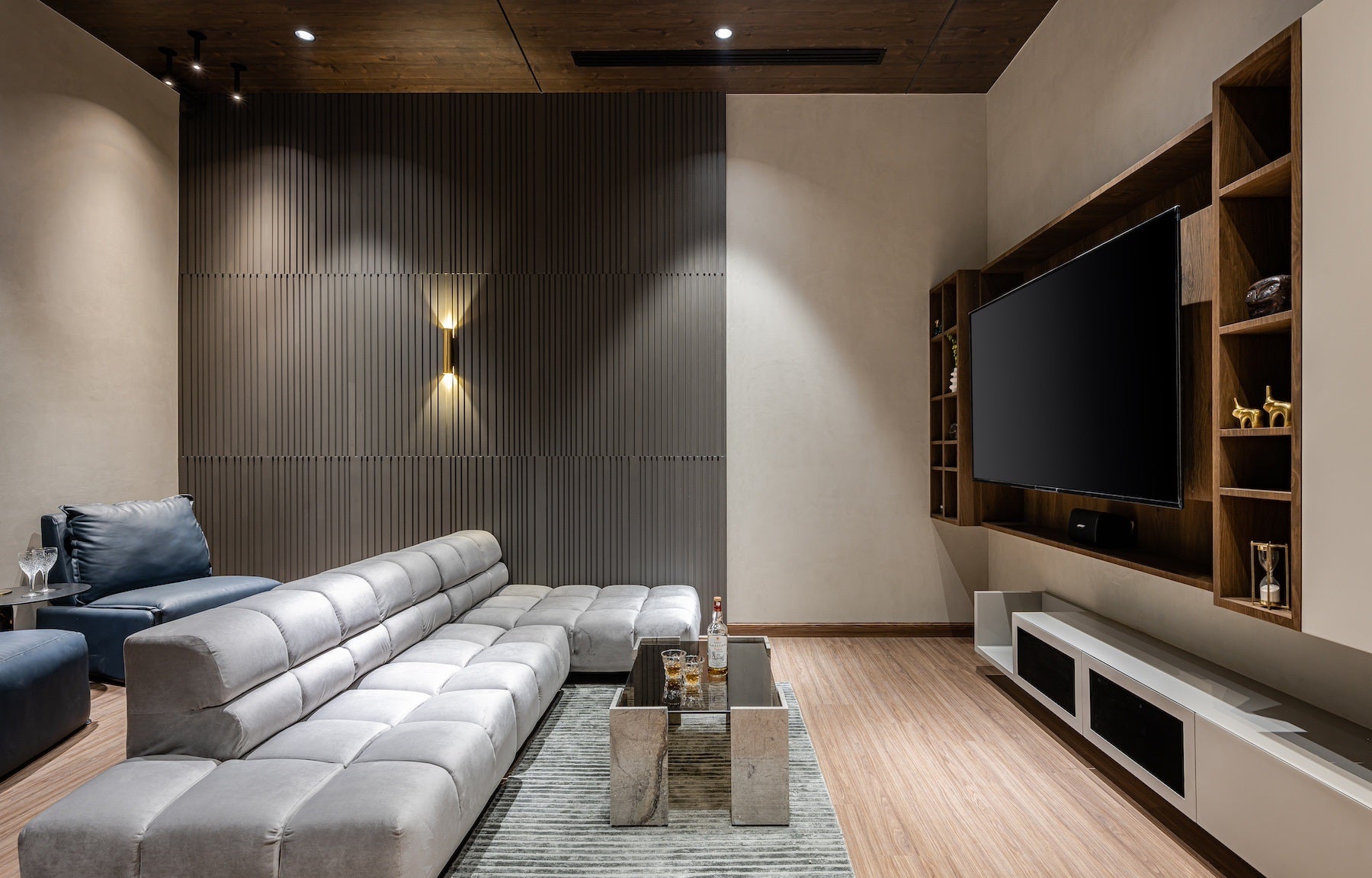 The home theatre is designed for ultimate relaxation and entertainment. A comfortable silver lounge sofa set, paired with an accent chair, creates a cozy yet stylish seating arrangement. The marble and glass top center table adds a touch of sophistication, making this space ideal for both leisurely movie nights and social gatherings. Here, functionality and luxury converge, promising endless hours of enjoyment.