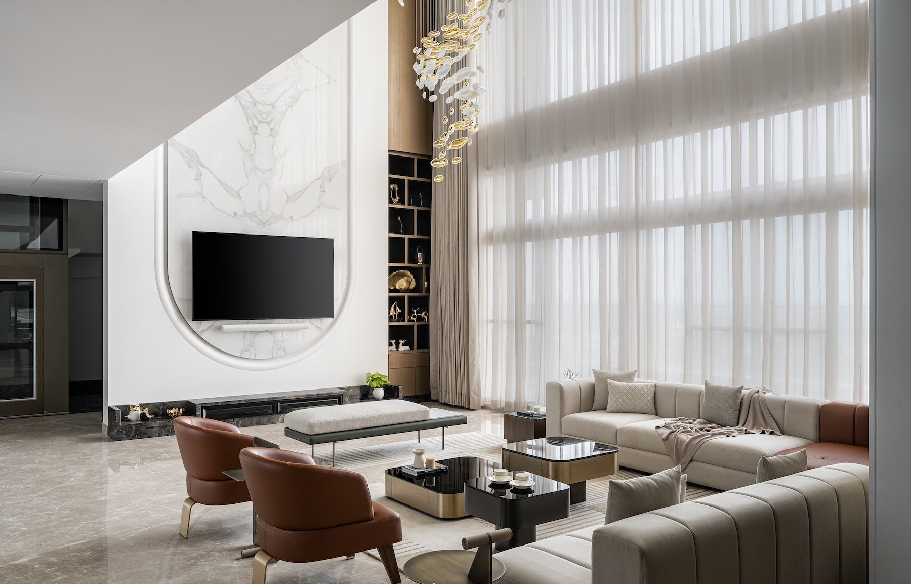 The living room, spacious and inviting, is anchored by a beige and brown sofa set that defines modern aesthetics. Accent chairs and an ottoman offer additional seating, while a dual-height marble table and wooden side tables add layers of sophistication, inviting you to sink into its embrace. Wooden side tables add a touch of warmth, creating a perfect mix of materials and textures. The brown accent chair brings a splash of vibrancy, harmonizing with the area’s serene palette.